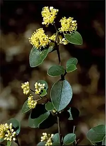 Pomaderris cocoparrana, commonly known as Cocoparra pomaderris,[2] is a species of flowering plant in the family Rhamnaceae and is endemic to a restricted area of New South Wales. It is a shrub with hairy stems, egg-shaped to more or less round leaves, and clusters of yellow flowers.