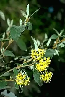 - Pomaderris pilifera subsp. talpicutica A.M.Gray & Wapstra[8] that differs from the autonym in having leaves densely covered on the upper surface with dull grey, velvety, star-shaped hairs and a small notch at the tip of the leaves. The epithet talpicutica means "moleskin", referring to the soft layer of hairs on the upper surface of the leaves.[9]