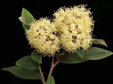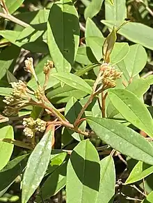 Pomaderris walshii, commonly known as Carrington Falls pomaderris,[2] is a species of flowering plant in the family Rhamnaceae and is endemic to a restricted area of New South Wales. It is a shrub or small tree with hairy young stems, narrowly egg-shaped leaves, and panicles of cream-coloured to yellow flowers.