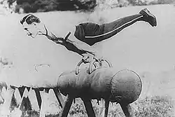 The apparatus originates from the Romans, who used wooden horses to teach mounting and dismounting. They later added it to the ancient Olympic Games. The basic modern exercises were developed in the early 19th century by Friedrich Ludwig Jahn, founder of the German Turnverein.[2]