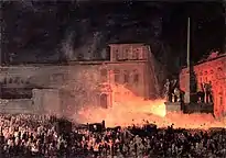 Pope Leo XII appointed the 35-year-old Mastai Ferretti Archbishop of Spoleto in 1827.[7] In 1831, the abortive revolution that had begun in Parma and Modena spread to Spoleto; the Archbishop obtained a general pardon after it was suppressed, gaining him a reputation for being liberal. During an earthquake, he made a reputation as an efficient organizer of relief and great charity.[7] The following year he was moved to the more prestigious diocese of Imola, was made a cardinal in pectore in 1839, and in 1840 was publicly announced as Cardinal-Priest of Santi Marcellino e Pietro. As in Spoleto, his episcopal priorities were the formation of priests through improved education and charities. He became known for visiting prisoners in jail and for programs for street children.[10] Cardinal Mastai Ferretti was considered a liberal during his episcopate in Spoleto and Imola because he supported administrative changes in the Papal States and sympathized with the nationalist movement in Italy.