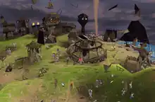 Whereas previous Populous games were god games where players assumed the role of a god with terrain-altering abilities, Populous: The Beginning adopts elements of real-time strategy games. Rather than being a god, the player controls a Shaman trying to become one, and directly controls the actions of followers by ordering them to build structures or attack enemies.[5][6][7] In the campaign, the player must fight the opposing Dakini, Chumara and Matak tribes for dominion over the solar system.[8] Enemy tribes also have shamans, and on later levels all inhabit the same world. While the objective is almost always to eliminate all of the members of the other tribes, there are often specific ways this can be achieved.[5] Sometimes the player must use magic spells gained from worship at special artifacts such as stone heads or obelisks;[9]: 3 these spells include tornadoes, storms, or volcanos that create new landmasses.[7] In other cases, the player only needs to overwhelm the enemies with superior numbers. The game has no formal resource management; new units are created automatically at houses, and training new troops costs nothing except mana. Only wood from trees is required to build new structures.[9]: 4–5