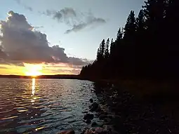 Woody River Recreation Site (52°28′45″N 101°42′03″W / 52.4791°N 101.7009°W / 52.4791; -101.7009)[17] consists of separate parcels of land plus additional Crown land centred around several lakes, Woody River, and Midnight Creek in the Porcupine Hills. Access is from Highway 980, which connects all of the lakes and amenities in the park, and by snowmobile. When travelling by snowmobile from the town of Hudson Bay, there are two warm-up shelters along the way.[18] Accessible lakes within the East Block include Isbister, Spirit, Smallfish, Woody, Elbow, and Townsend. All six lakes have boat access and fish commonly found in the lakes include walleye, perch, and northern pike. Campsites and picnic areas exist at Spirit, Isbister, Smallfish, and Townsend Lakes.[19] A rough ATV trail begins at the Spirit Lake Campground and heads north-east past Spirit Mountain and goes to Armit Lake, which is the largest lake in the Porcupine Hills.