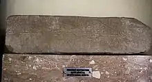 According to John David Hawkins, the stone block is made of white limestone, while Dietrich Berges and Johannes Nollé say it is light brown tufa. It measures 129 cm wide, 31 cm high and 35 cm deep.[2] On the upper side there are holes at left and right, which were used at that time for metal clips for securing masonry. Therefore, it is likely that the stone was part of a wall. On the upper edge of the front face is a one-line inscription in Luwian hieroglyphs, which is 14 cm high and runs from right to left. On the left edge under the inscription is another single-line right-to-left inscription. The inscription probably continued on other stones and then returned in a boustrophedon style which is not unusual in Luwian inscriptions. In that case, the isolated signs (zi+ra/i), which according to Hawkins might be a verb-ending, would be the end of the text.