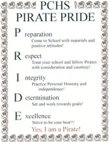 PCHS Pirate Pride poster seen on the walls throughout the PCHS campus as well as on the back of the PCHS Student Planner. Pirate P-R-I-D-E is "Preparation, Respect, Integrity, Determination, and Excellence."