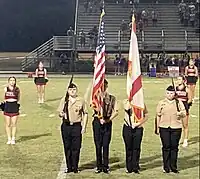 NJROTC Color Guard just before the performance of the national anthem at a football game, flanked by cheerleaders.