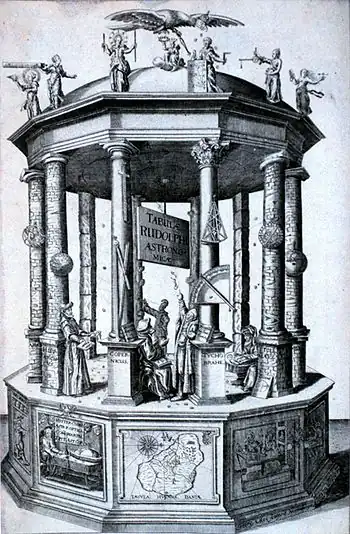 The iconic frontispiece to Johannes Kepler's 1627 Rudolphine Tables pays tribute to earlier great astronomers, including Copernicus, Ptolemy and most prominently Tycho Brahe. It was used in 2005 as the emblem for the joint meeting of the History of Science Society and the Society for the History of Technology.