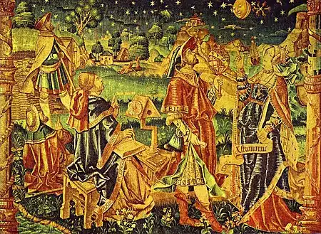 This iconographic French tapestry from the early 16th century depicts the muse Astronomia consulting with an astronomer, possibly Ptolemy. The tapestry resides in the Röhsska Konstslöjdmuseet, but its origins are unknown.