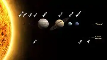Planets and dwarf planets of the Solar System; while the sizes are to scale, the relative distances from the Sun are not.
