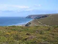 Porthtowan lies along the 627-hectare (1,550-acre) Godrevy Head to St Agnes heritage coast,[2] which is located on the north Cornwall coast of the Celtic Sea in the Atlantic Ocean. It lies between Godrevy Head (with the Godrevy Towans) and St Agnes Head, north of the village of St Agnes.[3][4][5] The Godrevy to St Agnes Heritage Coast has been a nationally designated protected area since 1986. The marine site protects 40 species of mammals and amphibians.[6][7]