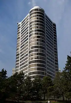 The Portland Plaza is a condominium skyscraper in downtown Portland, Oregon, United States. It stands at a height of 272 feet (83 m) and contains 26 floors. The Portland Plaza was designed by the firm of DMJM and was completed in 1973. The building is sometimes referred to as the "Norelco Building", owing to its metallic siding and its footprint bearing a resemblance to an electric shaver.