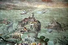 Detail of the fresco by Giorgio Vasari The taking of Porto Ercole (1570). You can see the various fortresses of the Republic of Siena (including the one on the islet called Forte Ercoletto) during the siege of the Sienese port (in the middle of the fresco) of 1555. - Porto Ercole is instead represented by Giorgio Vasari in the fresco The Taking of Porto Ercole, present in the Salone dei Cinquecento in Florence. With this work, Giorgio Vasari celebrated the conquest of the Sienese port on June 18, 1555 together with the greatest Florentine military victories, for the exaltation and glorification of the patron Cosimo I de Medici and his family.