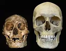 The first species in the genus Homo, Homo habilis, has been found in Tanzania and Kenya at sites dating between 2.1 and 1.5 million years ago.[11] Species within the genus Homo showed no difference within molar size up until Homo floresiensis, where smaller molars were beginning to be expressed.[12] Species after H. floresiensis such as H. heidelbergensis, H. neanderthalensis, and H. sapiens began to show instead wider frontal teeth and a decrease in size of the molars compared to earlier species.[13][14][15] H. sapiens shows significantly smaller molars, mandible, and a prominence of the chin.[15]