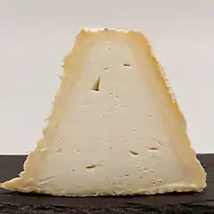 The cheese is distinctive, being pyramidal in shape and golden brown in colour with speckles of grey-blue mould, and is often known by the nicknames "Eiffel Tower" or "Pyramid". It has a square base 6.5 cm wide, is around 9 cm high, and weighs 250 grams (8.8 oz).[1] The central pâte is bright white with a smooth, crumbly texture that mixes an initial sour taste with salty and sweet overtones. The exterior has a musty odour reminiscent of hay.