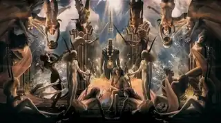 As the music begins, the camera slowly tracks out in one continuous take to reveal West standing at the end of a hallway of black columns, and surrounded by partially dressed female characters.[76][77] Some kneel before him, some embrace, four figures wear ibex-like horns; and some are inverted, pouring water that flows upward.[76][77] Two horned, staff-bearing figures, loosely resembling interpretations of Isis and Hathor, stand on either side of West; each slowly strikes the ground with their staff, in time to the music.[77] The Sword of Damocles hangs over the rapper's head, while other slowly moving figures appear ready to strike West with blades.[77] The various figures within the painting are presented in poses similar to the Major Arcana and Minor Arcana of the Etteilla occult tarot deck.[77] Anthony Beningo of Daily News described the ending of the video: