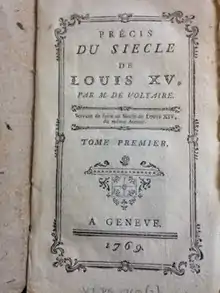 Précis du siècle de Louis XV (Short history of the Age of Louis XV) is a historical work by the French philosopher and author Voltaire, first published in its own right 1768.[1] Celebrating the progress of Enlightenment ideas and the retreat of prejudice, it comments on cultural, economic and technological progress made in the Kingdom of France during the reign of Louis XV of France.[1]