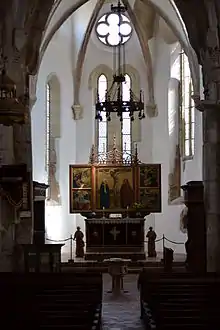 The triptych altarpiece, the oldest in the province, dates to around 1450; the main panel is joined to side panels painted on both faces, on two levels. The entire piece depicts scenes from the Passion of Christ. The Crucifixion is the central subject,[1] four times the size of the other panels, over half this panel is gilt. The front side panels show the Washing of the Feet, the Last Supper, the Flagellation and the Judgement of Caiaphas; the rear has the Weeping Women, the Entombment, the Resurrection and the Myrrhbearers. The figures are simple and reduced to their essentials, their movements restrained or even statuesque, their clothing unruffled. The backgrounds are cursory, with the interiors showing only slight attention to geometric perspective. The colors are vivid, with the reds given a particular glow by the gilt background.[4] The artist is unknown but was presumably trained in the Viennese school.[1] A bell tower was added above the center of the church in 1461. The Greek cross shape was modified between 1512 and 1515: two side naves of unequal size were added while the main one was extended. The interior is simple and does not have traces of frescoes, while 19th century paintings were removed during restoration.[2]