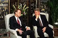 Chrétien was known to be a Sinophile and an admirer of the People's Republic of China. In November 1994, he led the first of four "Team Canada" trade missions comprising himself and 9 premiers to China (Quebec Premier Jacques Parizeau having declined to go), which had as their stated objective increasing Sino-Canadian trade. The Team Canada mission was meant to be the beginning of the export offensive that would stimulate the economy out of the recession, and also to achieve Chrétien's goal going back to the 1970s of a Canadian economy less dependent on trade with the United States.[78][79] Under his leadership, China and Canada signed several bilateral relations agreements. The Team Canada missions attracted criticism that Chrétien seemed concerned only with economic issues, that he rarely raised the subject of China's poor human rights record, and that on the few occasions that he did mention human rights in China he went out of his way to avoid offending his hosts.[80] Moreover, Chrétien attracted criticism for presenting the case for improved human rights in purely economic terms, arguing that a better human rights record would allow China to join the WTO and thus sell more goods to the West. Chrétien argued that there was no point in criticizing China's human rights record because the Chinese never listened to such criticism, and instead were greatly annoyed about being lectured by Western leaders about their poor human rights record.[81] Given that Canada could not really do anything to change the views of China's leaders about human rights, Chrétien contended that the best that could be done was to improve Sino-Canadian economic relations while ignoring the subject of human rights.[81]