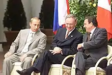 In the weeks leading to the referendum on October 30, 1995, the federal government was seized with fear and panic as polls showing that, under the leadership of Bouchard, the oui side was going to win.[6] An additional problem for the non side occurred when the Gaullist president of France, Jacques Chirac, stated in a TV interview that France would not only recognize an independent Quebec at once, but also use its influence within the European Union to have the other EU nations recognize Quebec as well, a statement that boosted support for the oui side.[7] Such was Chrétien's alarm at Chirac's remark that the prime minister—who normally fiercely resented anything that smacked of American interference in Canadian internal affairs in the slightest—lobbied U.S. President Bill Clinton behind the scenes for an American statement in favor of a united Canada.[7] Chrétien's efforts paid off, and Clinton not only came out very strongly for the federalist side in a TV interview, but also stated that an independent Quebec would not automatically became a member of NAFTA as the oui side was claiming.[7]