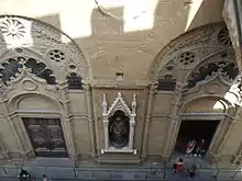The frame of the Adoration of the Magi is a Gothic design structure with impressive craftsmanship.[5] It reflects the International Gothic style of Florence with its thin, spiral columns and a composition made up of three main geometric, ornamental arches described as "mixtilineal" (but better known as a lambrequin arch).[5] The influence of Lorenzo Ghiberti is linked to the design of the frame due to his use of similar architectural motifs and designs in his sculptures created for the Orsanmichele in Florence. For example, in the Calamala niche for the sculpture of Saint John the Baptist, Ghiberti employed lambrequin arches to frame the central subject.[5] Gentile's altarpiece includes three of these lambrequin arches atop the painting.[5] These arches on the frame of the painting, like the ones in the Calamala niche, are both surrounded with decorative ornamentation.[5] Other elements of the frame's design relate to the Calamala niche including spiral columns that add beauty to the piers on the inner sides of the frame.[5] An architectural detail of the frame that differs from the Calamala niche but relates to the main entrance portals of the Orsanmichele, is the inclusion of a tondo that has been placed beneath each arch, and is therefore seen three times at the top of each lambrequin arch in Gentile's frame.[5] Elements that stand out in the frame's columns is not only the ornamentation and geometric patterns, but also the delicacy and richness.[5] There is even a rare feature of painted flowers on some of the piers further emphasizing Gentile's detailed craftsmanship.[3][15] The frame is also characterized with polychromy, gold, and silver, all of which offer an astonishing and brilliant effect.[5]