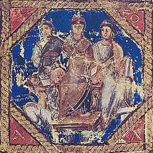 A presentation miniature or dedication miniature is a miniature painting often found in illuminated manuscripts, in which the patron or donor is presented with a book, normally to be interpreted as the book containing the miniature itself.[1] The miniature is thus symbolic, and presumably represents an event in the future. Usually it is found at the start of the volume, as a frontispiece before the main text, but may also be placed at the end, as in the Vivian Bible,[2] or at the start of a particular text in a collection.[3]