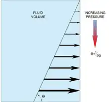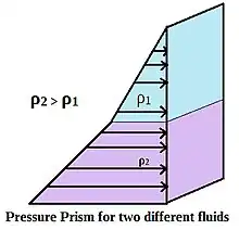 With two fluids of differing density in a volume, the slope of the pressure prism will not be constant over the depth. See Figure 3 (right).