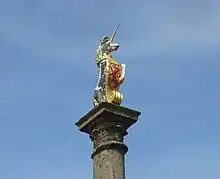 A war memorial, which commemorates the lives of local service personnel who died in the First World War, Second World War and the Spanish Civil War, stands near the town centre but is slightly obscured by the flanking buildings. It takes the form of a Scottish soldier in a Tam o' Shanter bonnet and greatcoat sculpted by William Birnie Rhind in 1921.[8]