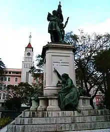 A woman, modeled on Preta Fernanda, points at the Marquis of Sá da Bandeira; Dom Luís Square, Lisbon