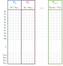 The adjacency matrix distributed between multiple processors for parallel Prim's algorithm. In each iteration of the algorithm, every processor updates its part of C by inspecting the row of the newly inserted vertex in its set of columns in the adjacency matrix. The results are then collected and the next vertex to include in the MST is selected globally.