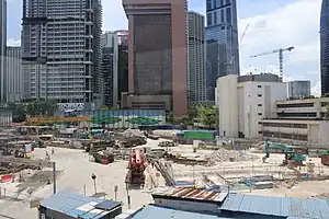 To facilitate the station's construction, the Shenton Way Bus Terminal was relocated on 25 June 2017.[9][10] On 8 March 2020, the concrete casting for the station's underground roof slab was completed. The Tunnel Boring Machine (TBM) Sun Wu has also completed half of the tunnelling works towards the adjacent Cantonment station.[11] Due to the COVID-19 pandemic, tunnelling work was briefly suspended to prevent any spread of the virus.[12] In September, the Sun Wu TBM managed to tunnel underneath the old Tanjong Pagar Railway station building. The tunnelling towards the station required close monitoring with devices installed to ensure no damage made to the sculptures and interior of the station.[13]