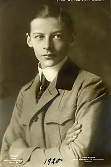 On his tenth birthday in 1916, Wilhelm was made a lieutenant in the 1st Guards Regiment, and was given the Order of the Black Eagle by his grandfather.[3] Two years later, when he was only twelve, the German monarchy was abolished. Wilhelm and his family remained in Germany, though his grandfather, the former Emperor, went into exile in the Netherlands. The former Crown Prince and his family remained in Potsdam, where Wilhelm and his younger brothers attended the local gymnasium.