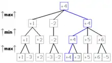 The principal variation of this minimax game tree is shown in blue