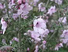 Prostanthera, commonly known as mintbush or mint bush,[2] is a genus of about 100 species of flowering plants in the mint family Lamiaceae, and all are endemic to Australia. Plants are usually shrubs, rarely trees with leaves in opposite pairs. The flowers are arranged in panicles in the leaf axils or on the ends of branchlets. The sepals are joined at the base with two lobes. The petals are usually blue to purple or white, joined in a tube with two "lips", the lower lip with three lobes and the upper lip with two lobes or notched.