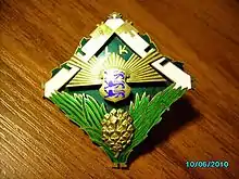 This Medal was granted in three ranks by the Council of Protection of Natural Amenities. This is a rhombus-shaped badge (in gold, silver or bronze, respectively to the rank) with green enamel, representing small State Arms with rays and letters LK (Looduskaitse), bordered by the gable of an Estonian farmhouse above, and a pine-cone with needles below. Medal exists in full size, worn in right breast, or in miniature, worn in left buttonhole.