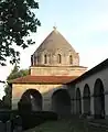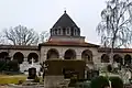 The Evangelical Protestant Central Cemetery in Regensburg was inaugurated on November 2, 1898. It blends the elements of a rural cemetery in a landscaped park-like setting with a monumental Christian cemetery character. The new central cemetery was the successor to two older non-existent Protestant cemeteries, namely the Lazarus cemetery and St. Peter's cemetery, which were both located near the city wall. To establish a new cemetery catering to all Protestant parishes of Regensburg, the Evangelical Lutheran deanery set up a commission that included Julius Pöverlein and Christian Zinstag as architects and appointed Conrad Mayer as a landscape designer. Some additional requirements from the city had to be taken into account, because part of the cemetery land was to be used as a communal municipal cemetery under the control of the city administration in order to bury the non-religious citizens without any church affiliation and serve as a potter's field for found unidentified decedent as well as suicide burials. The mortuary and a prayer hall were built in the Neo-Renaissance style in 1898. Access to the cemetery is from the north via a three-arched portal designed by German Bestelmeyer, with the Biblical inscription “Your dead shall live” (Isaiah 26:19) above the central arch, topped by a large stone cross. The cemetery was consecrated on November 2, 1898 by Rudolf Woldemar Koch, the Lutheran provost General-Superintendent, and the first burial recorded on the cemetery grounds was Luise Hirschmann, the wife of the stonemason Gottfried Hirschmann, who was also involved in the design of the cemetery. In mid-July 1899, an approximately 10 meters long gigantic crucifix was placed on the cemetery ground which was created by the sculptor Anton Hess. The cemetery houses many ornate mausoleums and family chapels, including the impressive Dörnberg mausoleum, built between 1911 and 1914. The mausoleum is characterized by an exterior staircase flanked by resting lions and a high, steep-arched stone dome with shell limestone cladding based on the Byzantine architecture. Above the portal is the coat of arms of the Von Dörnberg family. In the interior, vaulted by a flat dome painted in Art Nouveau style, is the circular crypt with eight burial chambers. The room is decorated with mosaics and a large Caritas figure, as well as a bust of Ernst von Dörnberg.[1] [2] [3]