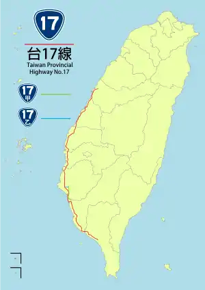 Provincial Highway 17 (PH 17), Chinese: 台17線) is a north–south highway from Qingshui in Taichung City to Fangliao in Pingtung County. The highway is known as Western Coastal Highway (西部濱海公路) since it runs parallel to the western coasts of Taiwan. Since the completion of PH 61 expressway, which parallels PH 17, the latter now mostly handles local traffic. The total length of the highway is 273.474 kilometres (169.929 mi).[1]