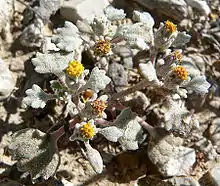 Psathyrotes annua is a species of flowering plant in the aster family known by the common names annual psathyrotes, turtleback, or mealy rosettes.[1][2] It is native to the southwestern United States and as far north as Idaho. It grows in desert and scrub habitat, often in areas with alkali soils among plants such as shadscale. It is a low, flat or mounding plant with spreading, hairy, scaly stems. It is pale green to reddish purple in color with gray-green leaves, its color dull from the coating of fibers on its surface. The irregularly rounded leaf blades are up to 1.6 centimeters long with wavy or toothed edges. The knobby inflorescence arises from the leaf axils. It is lined with hairy gray-green phyllaries with dull points that curve outward. It contains several hairy yellow to reddish disc florets. The fruit is an achene covered densely in long hairs and tipped with a large pappus of bristles.