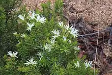 • Pseudanthus ligulatus subsp. ligulatus Halford & R.J.F.Hend.[4] is a shrub up to 1.5 m (4 ft 11 in) high with its leaves evenly distributed along the branchlets, the tepals of female flowers more than 2 mm (0.079 in) long.[2]