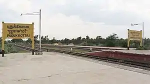 Pudukkottai railway station is a railway station in Pudukkottai town, serving the people of Pudukkottai District in Tamil Nadu. It falls under the operational limits of Madurai Railway Division of the Southern Railway zone. It is a major as well as an important passing station present on the Tiruchirappalli-Karaikkudi railway line.[1] It is under the station Grade B and the category is NSG-5 .