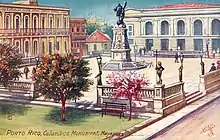 1905 postcard depicting Colón Square, the main plaza of the pueblo of Mayagüez where the city hall and Catholic cathedral are located.