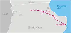 In 1912 the railway reached Las Heras, which would be its definitive terminus. Nevertheless, the National Government decided to reduce the amount of money sent to the line. In spite of the requests by regional neighborhoods demanding a longer railway line, it never happened.[2] Besides, the route chosen for the railway was criticised due to it ran parallel to the sea, adversely competing against the ports of Caleta Olivia, Cabo Blanco and Mazaredo because of the lower costs to transport wool by sea.