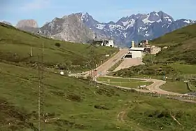 ![]() View of the N-630 crossing Puerto de Pajares from the east, with Ubiña Massif in the background | |