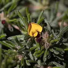 Pultenaea canaliculata, commonly known as coast bush-pea,[2] is a species of flowering plant in the family Fabaceae and is endemic to coastal areas of southern continental Australia. It is a rigid, spreading shrub with hairy, cylindrical leaves, and yellow and crimson flowers.