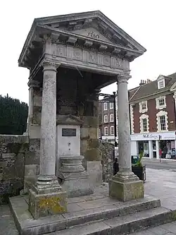 On 4 June 171, a fire destroyed almost the entirety of the town of Blandford Forum. Around 15 people were killed and over 90% of the town's buildings razed.[1] Rebuilding of the town was led by the Bastard brothers, John and William, who worked as builders and architects in the town.[2] John Bastard designed and paid for the monument which was erected in 1760.[lower-alpha 1][3] It was sited above a spring, to provide a water source in the event of a further fire. This was converted to a drinking fountain in 1899.[3]