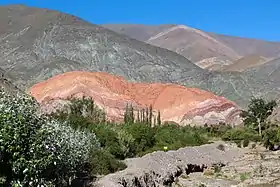 It is located at the Quebrada de Purmamarca, sometimes considered part of the Quebrada de Humahuaca. The Cerro de los Siete Colores (Hill of the Seven Colours) shows its colourful face to the nearby town.