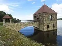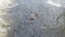 Along this spillway are a wildlife museum and the Linesville spillway, a site famous as "The Place Where the Ducks Walk on the Fishes' Backs".[2][6] Many people throw bread into the water here, and the resulting density of fish (carp) enables the ducks and other waterfowl to walk on top of the carp to vie for the thrown food. The spillway was renovated in 2007.[2] The Pennsylvania Department of Conservation and Natural Resources had planned to prohibit bread as food for the carp and ducks on January 1, 2009, only permitting commercial fish food as part of an effort to clean up the area and increase its wild nature, but subsequently reconsidered.[7]