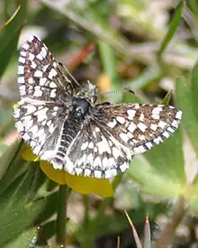 The Laguna Mountains skipper is a small, black and white checkered butterfly belonging to the family Hesperiidae. It has a wingspan of about 1 inch (3 cm) and a fast, erratic flight pattern. This endangered butterfly is found only in Southern California, occupying areas of high elevation in the Cleveland National Forest in San Diego, California. Phenotype differences between males and females represented by more white coloration of wings of males compared to that of females. This taxon is one of two subspecies of the rural skipper, Pyrgus ruralis. The other subspecies, Pyrgus ruralis ruralis, occupies a much larger range stretching from British Columbia to Central California.