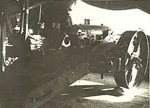 British forces in the Second Boer War were initially outgunned by the long range Boer artillery. Captain Percy Scott of HMS Terrible first improvised timber static siege mountings for two 4.7-inch (120 mm) guns from the Cape Town coastal defences, to counter the Boers' "Long Tom" gun during the Siege of Ladysmith in 1899–1900.[7] Captain Scott then improvised a travelling carriage for 4.7-inch guns removed from their usual static coastal or ship mountings to provide the army with a heavy field gun. These improvised carriages lacked recoil buffers and hence in action drag shoes and attachment of the carriage by cable to a strong point in front of the gun were necessary to control the recoil.[7] They were manned by Royal Navy crews and required up to 32 oxen to move.[7]