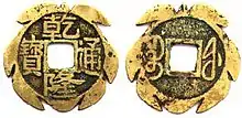 Ancestor coins (simplified Chinese: 祖钱; traditional Chinese: 祖錢; pinyin: zǔ qián) also known as engraved mother coins (Chinese: 雕母; pinyin: diāo mǔ) were introduced around 1730 during the Qianlong period in middle of the eighteenth century to improve the quality control of mother coins, these ancestor coins were used to cast more mother coins and from a single ancestor thousands of mother coins could be cast. The production process of making mother coins with ancestor coins was the same as it was for the casting of circulation coins from mother coins, however these coins were usually only produced for a new reign title, when preparing to cast new cash coins with new inscriptions for a recently ascended emperor, a mint would first engrave an ancestor coin out of fine brass which would form the basis for mother coins. The introduction of ancestor coins under the Manchu Qing dynasty lead to all mints having more consistently produced coinages and smaller variations between the coins produced by separate mints in both inscription (or legend) as well as in quality.[5][6][7][8][9][10]