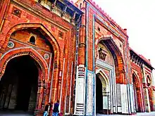 Two octagonal turrets are attached to the ends of the rear wall, "which are functional as well as structural".[9] In the edifice, objects reminiscent of Tughlaq architecture (decorative brackets with oriel windows, sunshades, narrow turrets) are found. The walls are ornamented with hexagonal star motifs which have coloured geometric patterns.[9] The walls are filled with calligraphy.[8] The mosque has two internal staircases located in the end bays. They were used to reach the terrace and the turrets.[11] It also had private entrances on the north and south sides which are currently closed.[9] The mosque also has "cusped entrance arches", a feature common during the reign of Alauddin Khalji.[12]